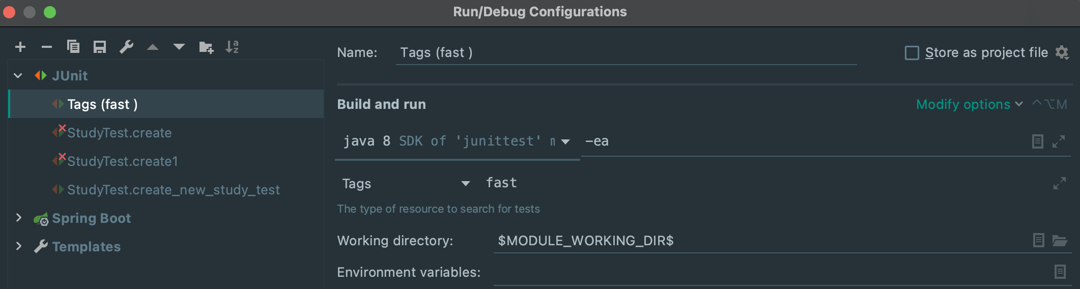 @DisplayName("스터디 클레스") class StudyTest { @Test @DisplayName("스터디 만들기☺️") @FastTest void create_new_study_test() { String test_env = System.getenv("TEST_ENV"); //환경변수를 받환 System.out.println(test_env); } @Test @slowTest @Tag("slow") //원격환경에서 void create_again_study_test(){ System.out.println("다른 테스트 "); } }