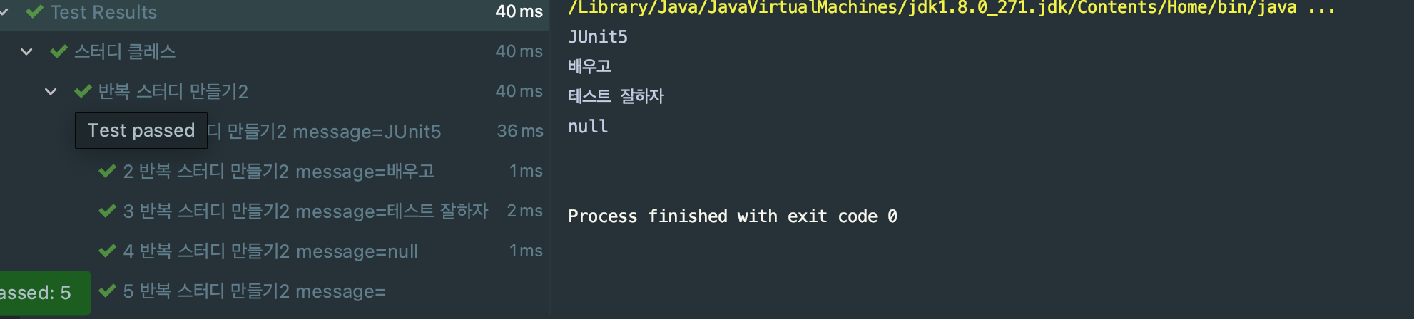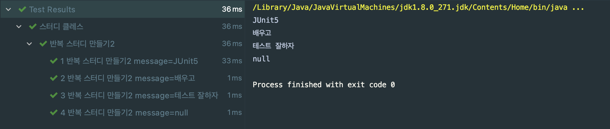 @DisplayName("반복 스터디 만들기2") @ParameterizedTest(name ="{index} {displayName} message={0} ") @ValueSource(strings = {"JUnit5","배우고","테스트 잘하자"}) @NullSource // @EmptySource // @NullAndEmptySource void ParameterizedTest(String message){ System.out.println(message); }