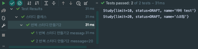 테스트에 반복할 매개변수가 {{"10", "자바 test"}, {"20","스프링"}}이 각각 테스트로 진행되며, 숫자들은 암묵적인 형 변환으로인해 Integer로 인자값이 변환된다.