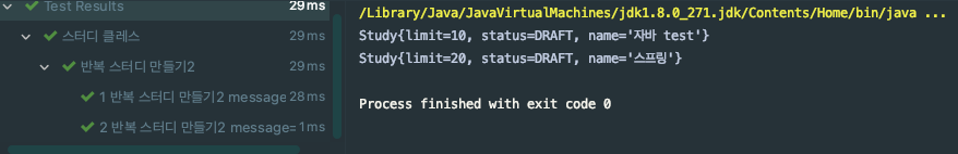 @DisplayName("반복 스터디 만들기2") @ParameterizedTest(name = "{index} {displayName} message={0} ") @CsvSource({"10, 자바 test","20, 스프링"}) void ParameterizedTest(Integer integer,String string) { Study study = new Study(integer,string); System.out.println(study); }Study생성자는 다음과 같다.