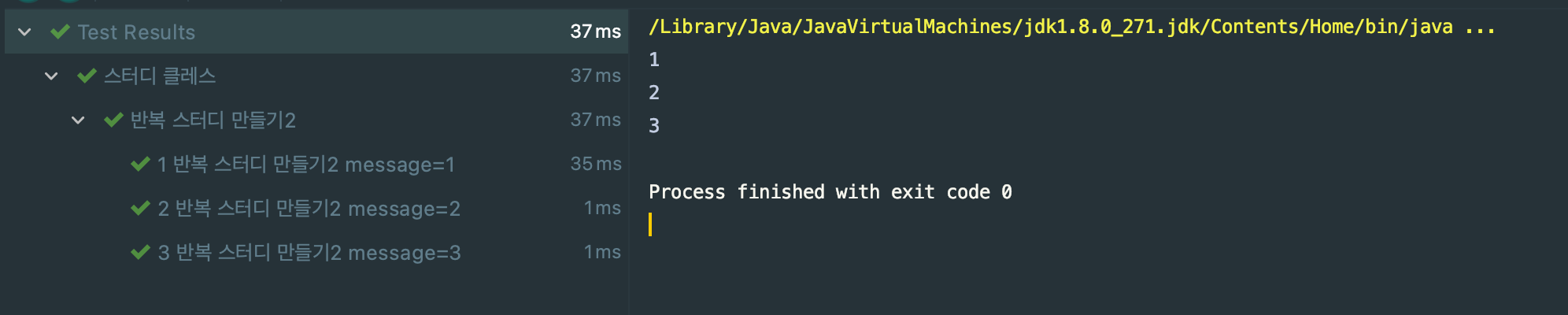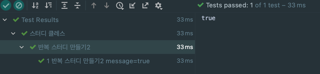 @DisplayName("반복 스터디 만들기2") @ParameterizedTest(name ="{index} {displayName} message={0} ") @ValueSource(strings = {"true"}) void ParameterizedTest(Boolean test){ System.out.println(test instanceof Boolean); }