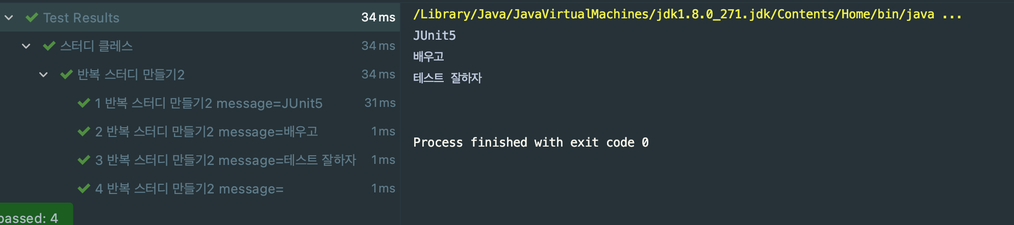 @DisplayName("반복 스터디 만들기2") @ParameterizedTest(name ="{index} {displayName} message={0} ") @ValueSource(strings = {"JUnit5","배우고","테스트 잘하자"}) // @NullSource @EmptySource // @NullAndEmptySource void ParameterizedTest(String message){ System.out.println(message); }