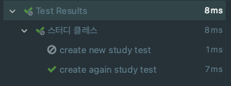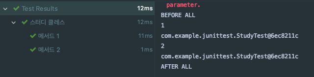 package com.example.junittest; import org.junit.jupiter.api.*; @DisplayName("스터디 클레스") class StudyTest { int value = 1; @Test @DisplayName("메서드 1️") @Order(2) void create_new_study_test() { System.out.println(value); value++; System.out.println(this); } @Test @DisplayName("메서드 2") @Order(1) //원격환경에서 void create_again_study_test() { System.out.println(value); value++; System.out.println(this); } @BeforeAll static void beforeall() { System.out.println("BEFORE ALL"); } @AfterAll static void afterall() { System.out.println("AFTER ALL"); } }[결과]