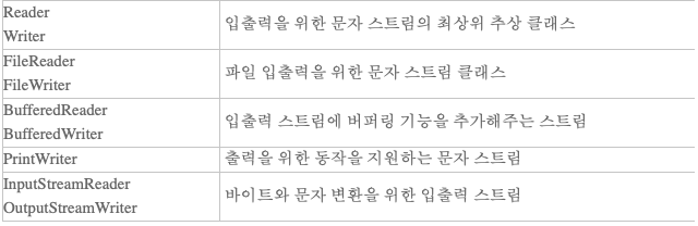 - Character 스트림의 경우 char형, 즉 2바이트씩 처리해 한 문자씩 입, 출력 받을수 있다.