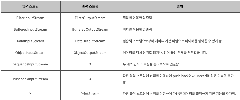 - 문자 스트림과 바이트 스트림은 모두 바이트 단위로 데이터를 입출력한다는 것은 동일하지만 각기 다른 역활을 수행하는 입출력 스트림이다.