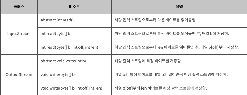 - InputStream과 OutputStream는 바이트 기반 스트림의 최상위 추상클래스이다.