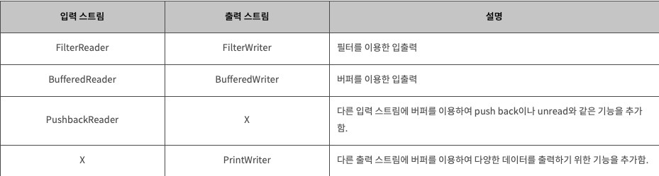 보조 스트림은 다음과 같다.스트림이 바이트 혹은 한 문자씩 가지고 오는 것을 버퍼에 저장후 데이터를 입/출력한다스트림의 기능은 없지만, 기능을 향상시키거나 새로운 기능을 추가할수 있다.