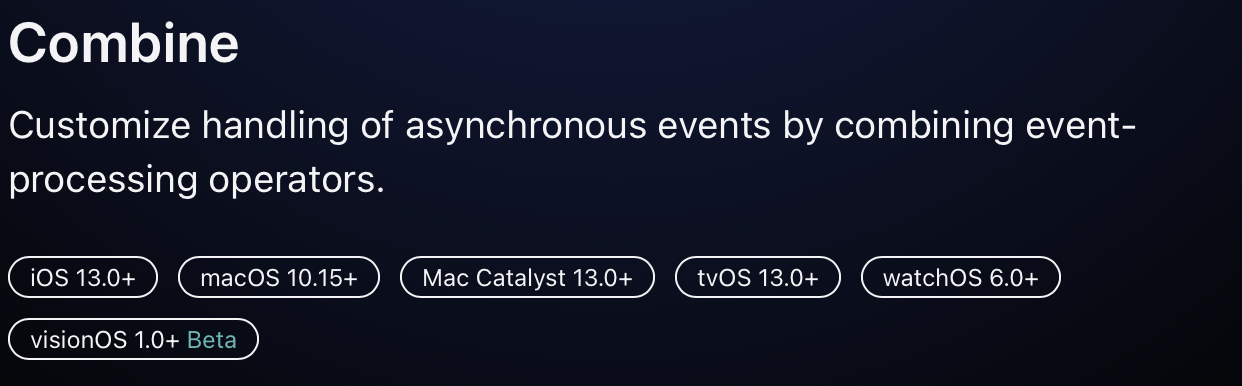 또한 Combine을 사용할 때에 주의할 점이 iOS버전인데요, 최소 13 버전 이상에서만 지원가능 하다고 합니다. 현재 2024년에 iOS 18 버전이 나올 거 같은 시점인데요. iOS13 버전이라면 2019년이니 Combine도 이쯤에 출시된 거 같네요