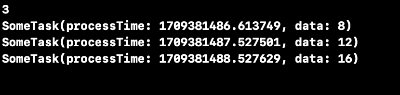 struct SomeTask { let processTime: TimeInterval let data: Int } let publihser = PassthroughSubject<SomeTask, Never>() var subsciprionts = Set<AnyCancellable>() var now = Date().timeIntervalSince1970 var repeatCount = 1 // 매 1초마다 데이터를 방출 let task = DispatchQueue.main.schedule(after: DispatchQueue.main.now, interval: .seconds(1.0), { if repeatCount < 4 { repeatCount += 1 let task = SomeTask(processTime: Date().timeIntervalSince1970, data: repeatCount * 4 ) publihser.send(task) } }) // 3개의 값을 한번에 처리하는 예제 publihser .collect(3) .sink { // 3개의 값을 배열로 묶어서 print한 것 print($0.count) $0.forEach { someTask in print(someTask) } } .store(in: &subsciprionts) // 방출된 값을 각각 처리하는 예제 publihser.sink { print("Time is", "\(Int($0.processTime - now))") print("Data is ", $0.data) print("=========================================") } .store(in: &subsciprionts)