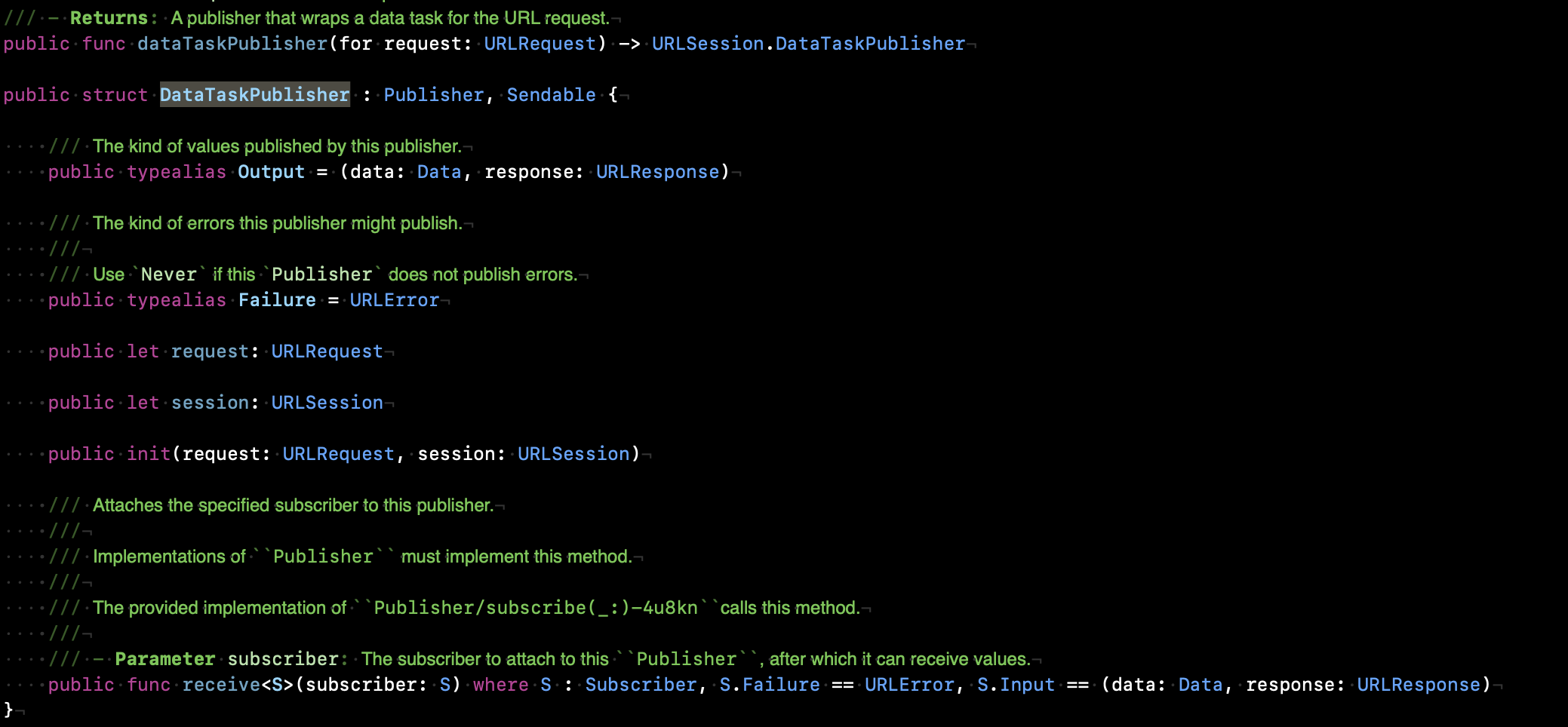DataTaskPublisher가 conform 하는 프로토콜 중에 Publisher가 있는데 이것이 Combine프레임 워크의 요소 중 하나인 Publisher입니다. Publisher 외에 Subsciprtion과 Subscriber가 있는데 이 부분은 글이 길어질 거 같아 다음 Combine 글에 올리겠습니다.