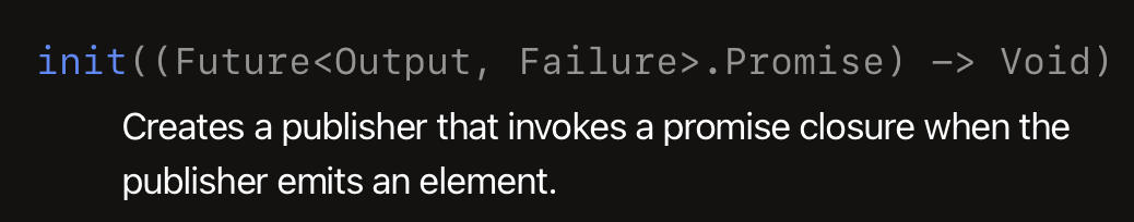 클로저 형태로 파라미터로 받는데요, Future<Output, Failure>.promise -> Void 형태로 받고 있습니다. Promise의 경우 다음과 같습니다.