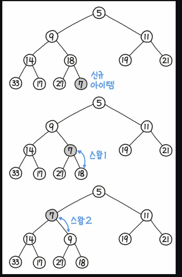 트리에 가장 끝 자리에 삽입하고, 부모 노드와 비교해 우선순위가 높다면 swap하는 방식입니다.