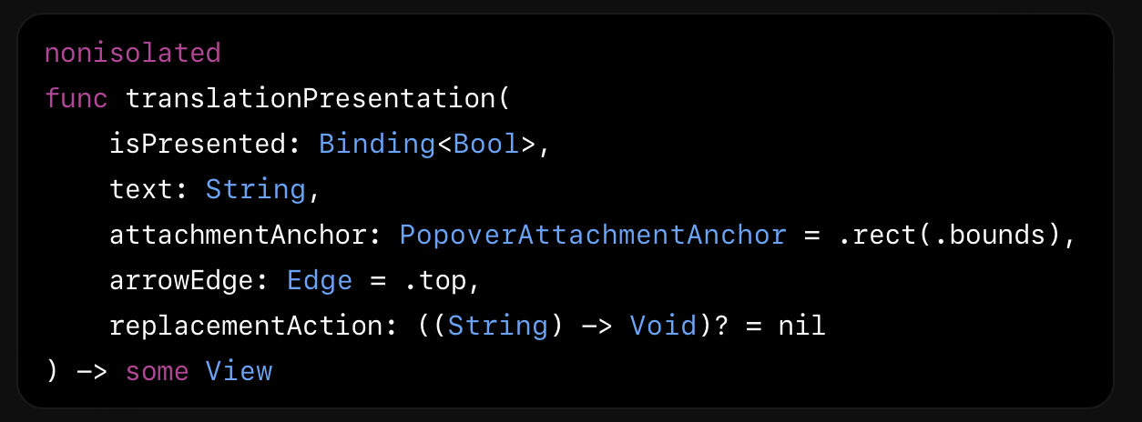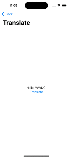 struct ViewTranslationView: View { // Define the condition to display the translation UI. @State private var showTranslation = false // Define the text you want to translate. var originalText = "Hallo, WWDC!" var body: some View { VStack { Text(verbatim: originalText) Button("Translate") { showTranslation.toggle() } } // Offer a system UI translation. .translationPresentation(isPresented: $showTranslation, text: originalText) .navigationTitle("Translate") } }(공식문서 예제 소스입니다.)