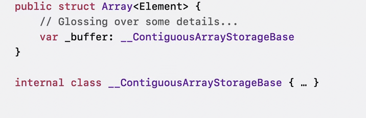 이걸 왜 말하냐면, 값 타입(struct, tuple, enum)의 경우 힙 메모리를 참고하고 있는 게 아닌, 그 인스턴스에 있는 자체 값들이 메모리 영역에 할당되는데, 배열의 경우는 포인터가 저장됩니다. 즉, 타입에 따라 메모리가 다르게 할당된다는 걸 말씀 드리고 싶었습니다.