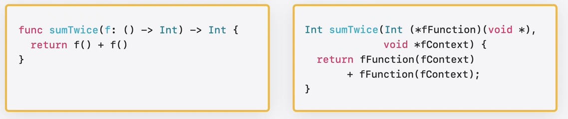 - Swift에서 함숫값은 항상 함수 포인터와, 콘텍스트 포인터 쌍으로 구성됩니다.