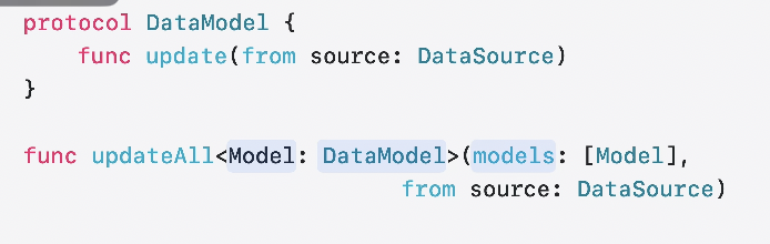 첫 번째 updateAll함수의 경우 제네릭으로 특정 유형의 같은 아이템들이 배열로 받습니다. 이 배열에 같은 유형의 크기들로 효율적으로 채워지며 파라미터로 함수 유형정보가 한 번에 전달됩니다.
