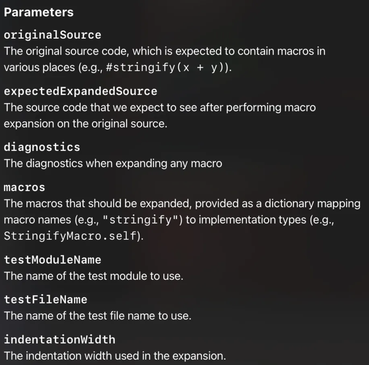assertMacroExpansion를 사용해 테스트하는데 메서드 시그니처는 다음과 같습니다.
