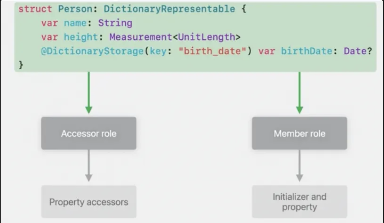 @DictionaryStorage struct Person: DictionaryRepresentable { init(dictionary: [String: Any]) { self.dictionary = dictionary } var dictionary: [String: Any] // Begin expansion for "@DictionaryStorage" @DictionaryStorage // End expansion for "@DictionaryStorage" var name: String // Begin expansion for "@DictionaryStorage" @DictionaryStorage // End expansion for "@DictionaryStorage" var height: Measurement<UnitLength> // 커스텀이 필요한 경우 @DictionaryStorage(key: "birth_date") var birthDate: Date? }attached memeber