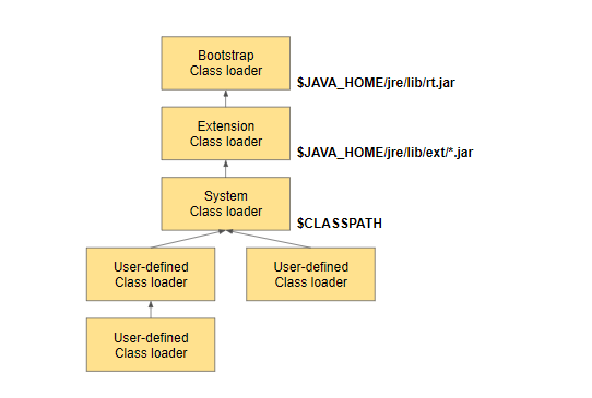 또한 클레스 로더의 특징을 말하자면 클레스 로더 끼리 부모-자식과 같은 관계를 이루는 계층적 구조를 가지며, 최 상위 클래스 Bootstrap class loader이다. 또한 위임 모델이란 특징을 나타내는데 그림으로 표현하자면 다음과 같다.