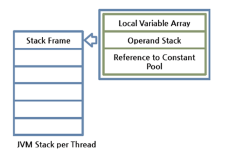●스택 프레임 : JVM내에서 메서드가 수행될 때마다 하나의 스택 프레임이 생성 되는데 해당 스레드의 JVM 스택에 추가된다. 만약 메서드가 종료 된다면 스택 프레임이 제거 된다. 각 스택 프레임은 지역 변수 배열, 피연산자 스택, 현재 실행중인 메서드가 속한 클래스의 런타임 상수 풀에 대한 래퍼런스를 갖는다.